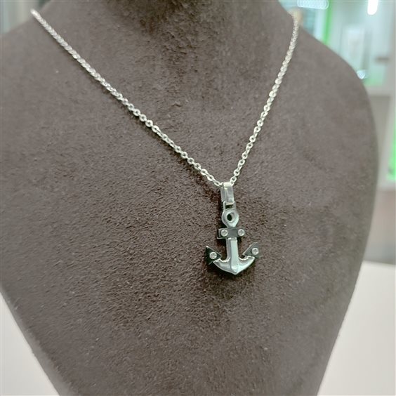 COLLANA IN ACCIAIO CON PENDENTE IN ACCIAIO E PVC COLORE NERO MOTIVO AD ANCORA CON PICCOLI PARTICOLARI A VITI.