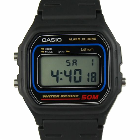 Orologio Casio W-59-1VQ con display digitale illuminato. Cassa e cinturino in resina, colore nero. Modello dallo stile vintage che riprende le icone Casio del passato. Calendario automatico, allarme giornaliero. Water Resistant 5 ATM
