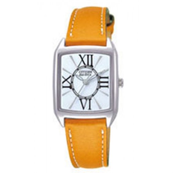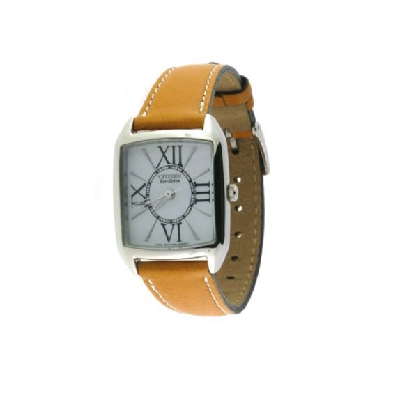 citizen rettangolare ecodrive numeri romani quadrante bianco ottico, cinturino pelle color ocra.