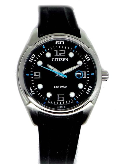 Orologio con cassa in acciaio lucido e satinato. Quadrante nero e vetro in cristallo minerale. Cintuirino in caucciù. Movimento Eco-Drive (a carica luce infinita) con 240 giorni di riserva di carica. Impermeabilità 10 BAR.