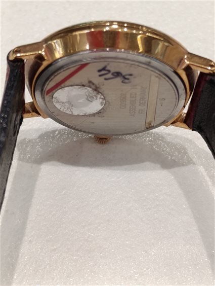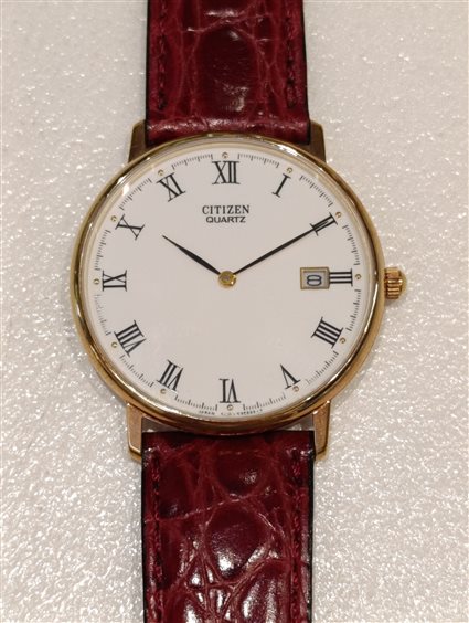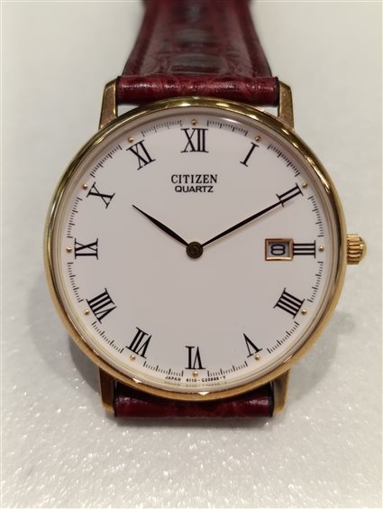 ELEGANTE OROLOGIO DA UOMO IN ACCIAIO COLOR ORO GIALLO, QUADRANTE NUMERI ROMANI COLORE NERO, SFERE ORE E MINUTI COLOR NERO, DATARIO NUMERICO. CINTURINO IN PELLE STAMPA COCCO MARRONE CHIARO.