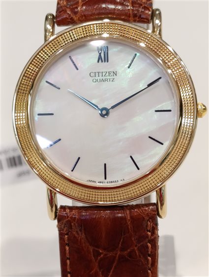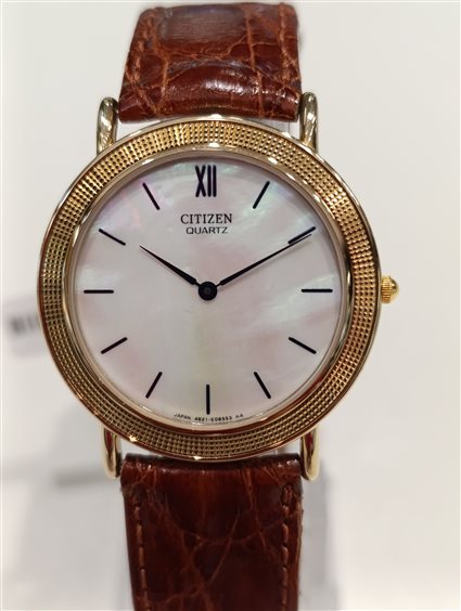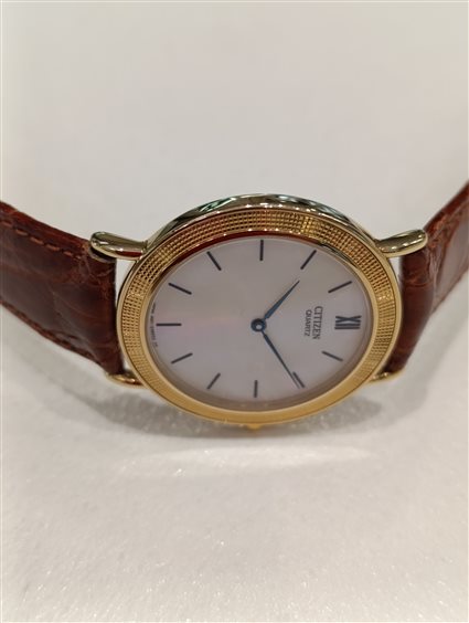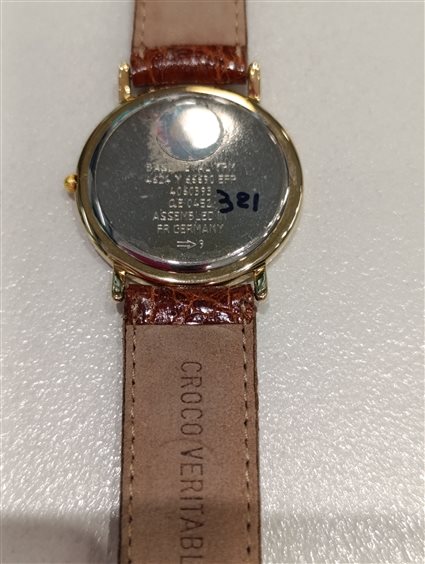 ELEGANTE OROLOGIO DA UOMO IN ACCIAIO LAMININATO COLOR ORO, QUADRANTE BIANCO, NUMERI ARABI COLOR ORO GIALLO, SFERE COLORE NERO. CINTURINO IN PELLE STAMPA COCCO COLORE MARRONE.