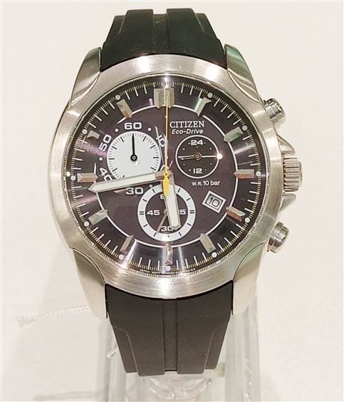 Citizen Crono EcoDrive AT0635-02F Movimento Eco Drive (a carica Luce Infinita) con riserva di carica di 180 giorni. Cronografo, calendario. Cassa in acciaio. Cinturino in gomma. Vetro minerale. WR 10 bar.