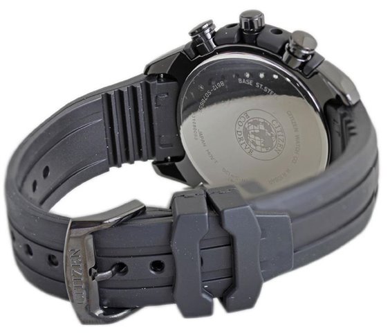 Orologio con cassa in acciaio con protezione laterale in 'HS tech', cassa diamentro 45mm. Cinturino in morbido caucciù. Quadrante nero e vetro minerale. Cronografo a 1/5 di secondo. Visualizzazione 24 ore. Movimento Eco-Drive (a carica luce infinita), con riserva di carica di 210 giorni. Impermeabilità 10 BAR.