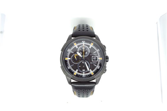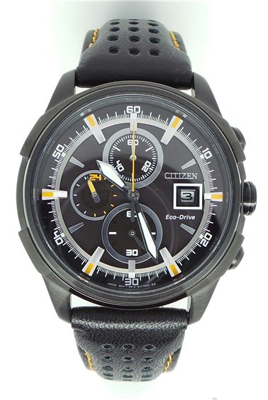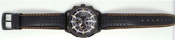Cronografo da uomo, movimento ECO-DRIVE a carica luce con riserva di carica di 210 giorni, cassa in acciaio brunito , fondello a vite , cinturino in morbida pelle, diametro cassa 45mm., impermeabile 10atm.(100m.), quadrante nero.