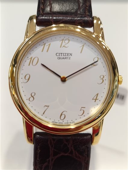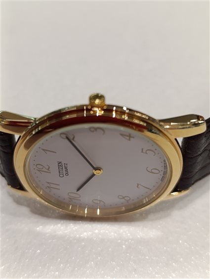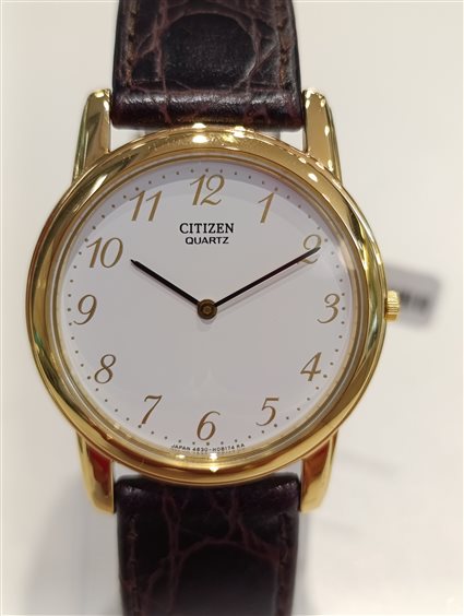 ELEGANTE OROLOGIO DA UOMO IN ACCIAIO, CASSA COLORE ORO GIALLO LAVORATA SULLA GHIERA. QUADRANTE IN MADREPERLA CON INDICI E SFERE SOLO TEMPO COLOR NERO. CINTURINO IN PELLE COCCODRILLO COLOR MARRONE CHIARO.