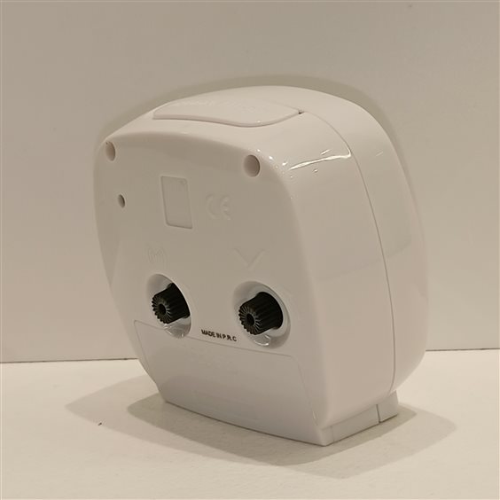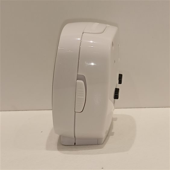 sveglia da comodino comoda con movimento silenzioso, anche da viaggio colore bianco con luce e tasto snooze, sfere luminescenti nuemri neri su fondo bianco. rettangolare 7x7.5.