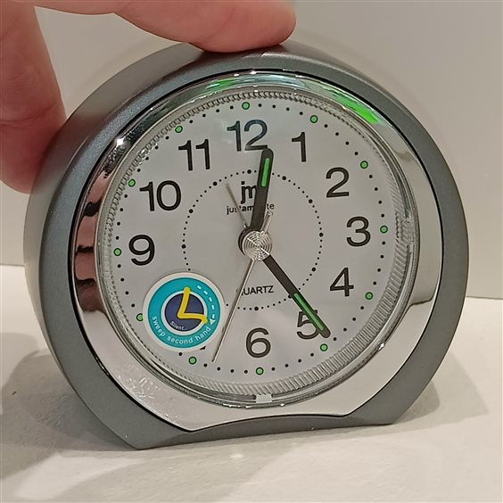 SVEGLIA IN PLASTICA COLORE GRIGIO SCURO, QUADRANTE BIANCO,SFERE ORA, MINUTI E SECONDI, MOVIMENTO CONTINUO. SNOOZE E LUCE.