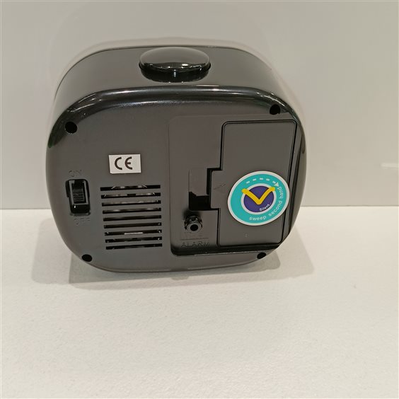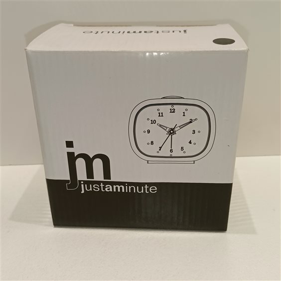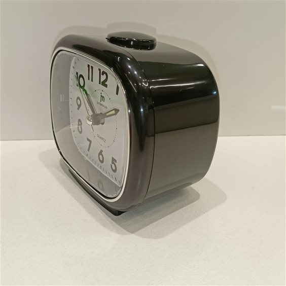 sveglia da comodino di ottima costruzione molto stabile con luce led e movimento continuo silenzioso, sfere luminescenti di colore nero lucido con suoneria campana meccanica e tasto riposo snooze. misure lunga 11,5x 10 cm di altezza.
