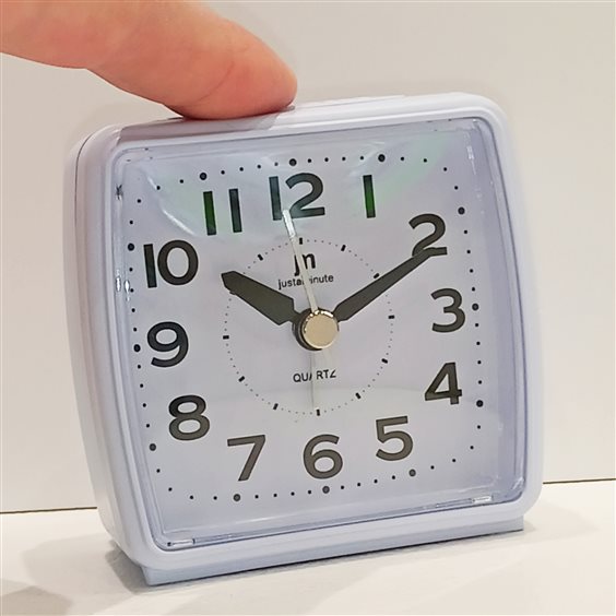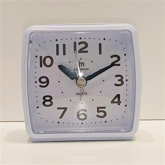 SVEGLIA IN PLASTICA COLORE BIANCO, QUADRANTE BIANCO E NUMERI ARABI, SFERE ORA, MINUTI E SECONDI, MOVIMENTO CONTINUO. SNOOZE-LUCE