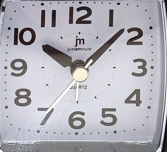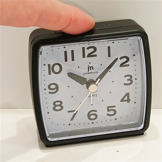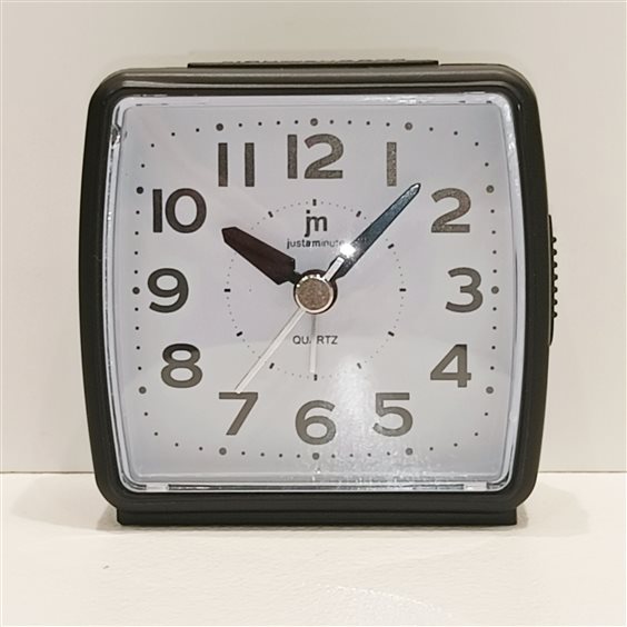 SVEGLIA IN PLASTICA COLORE NERO, QUADRANTE BIANCO E NUMERI ARABI, SFERE ORA, MINUTI E SECONDI, MOVIMENTO CONTINUO. SNOOZE-LUCE