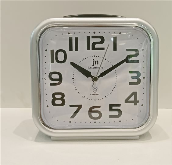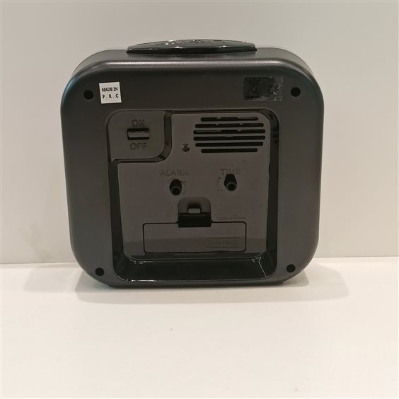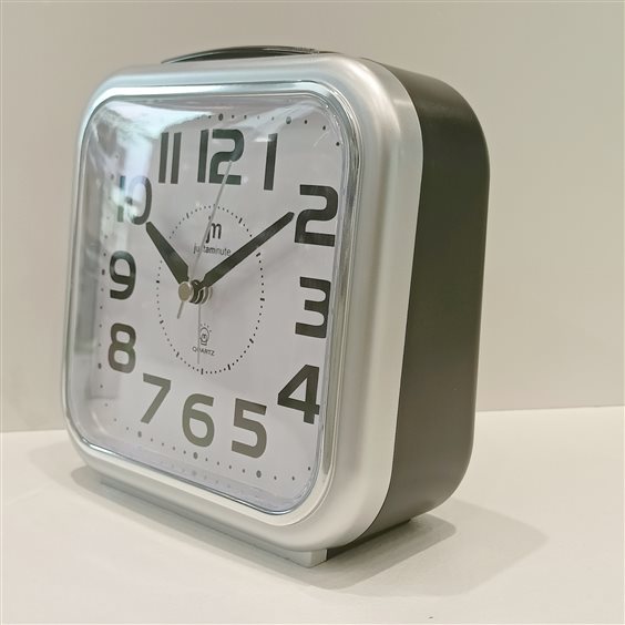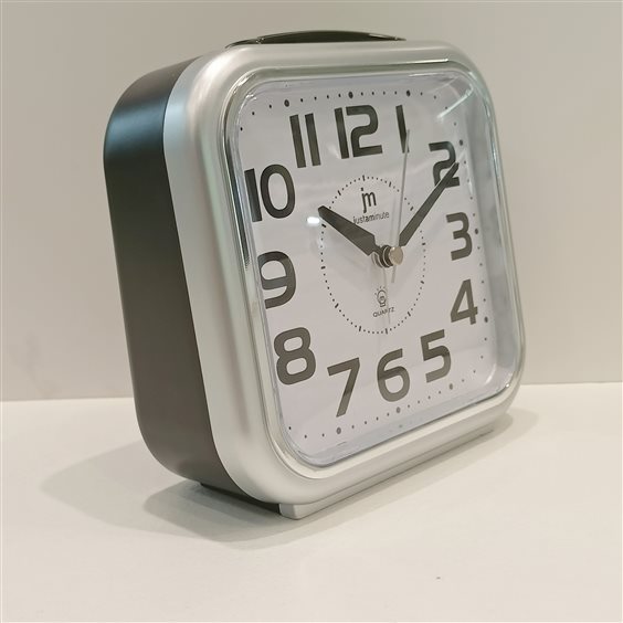 MODERNA SVEGLIA IN PLASTICA COLOR NERO E GRIGIO, QUADRANTE BIANCO CON NUMERI NERI. ALTEZZA CM.13.5 SFERA ORE, MINUTI E SECONDI.