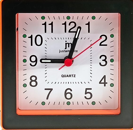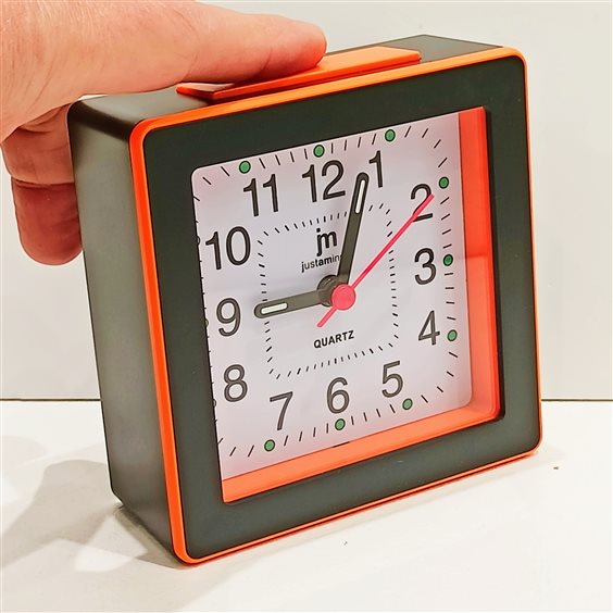 MODERNA SVEGLIA IN PLASTICA COLOR ARANCIONE E NERO, QUADRANTE BIANCO CON NUMERI ARABI NERI. SFERA ORE, MINUTI E SECONDI.