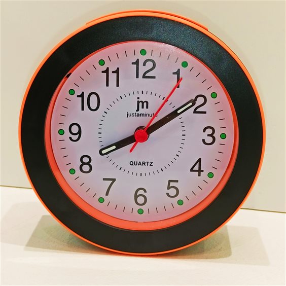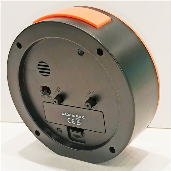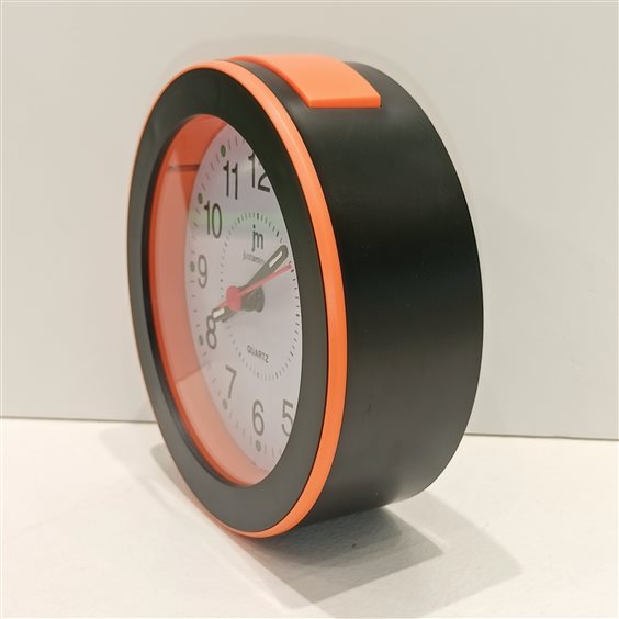 SVEGLIA IN PLASTICA ROTONDA, MOVIMENTO CONTINUO, SNOOZE E LUCE. COLORE ANCIONE E NERO, QUADRANTE BIANCO, NUMERI ARABI NERI.
