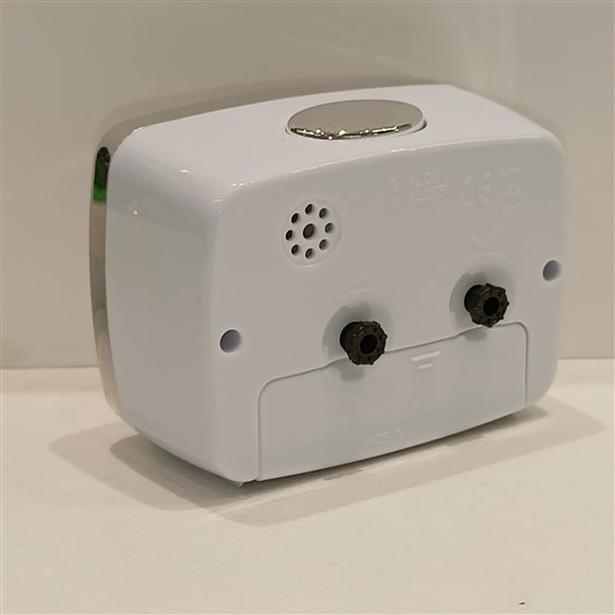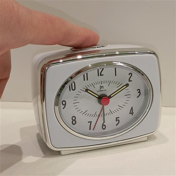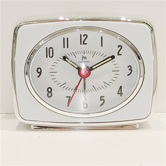 sveglia rettangolare bianca lucida con finiture cromate 9x7.5 sfere luminescenti sveglia con interruttore on off.