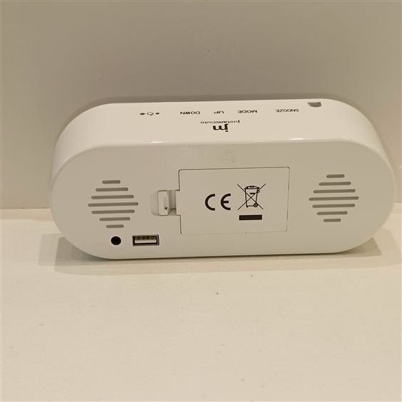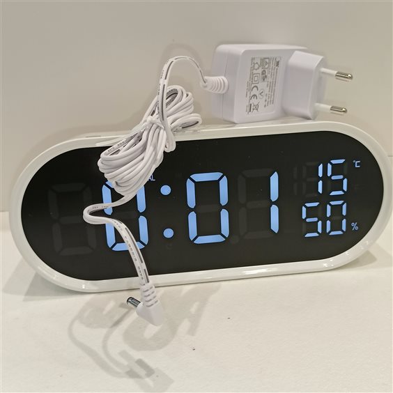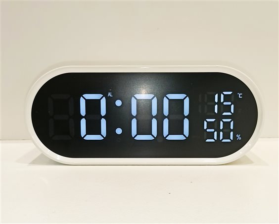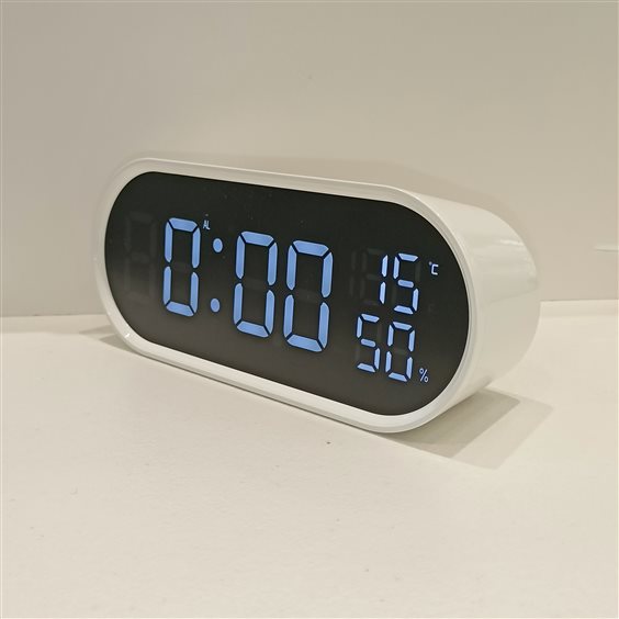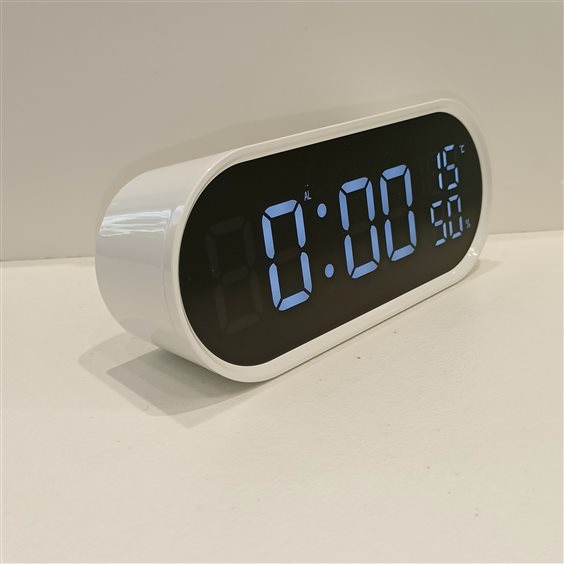 SVGLIA DIGITALE MULTIFUNZIONE COLORE BIANCO CON DISPLAY NERO E LED BIANCHI, INDICAZIONE DI TEMPERATURA E UMIDITA, PORTA USB PER RICARICA DAL TELEFONO