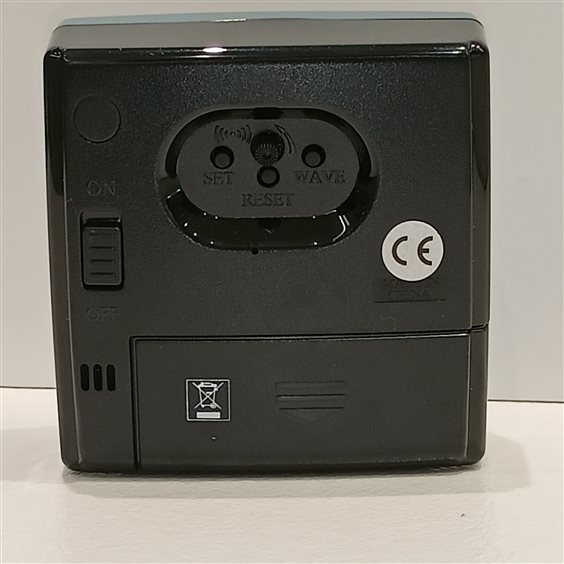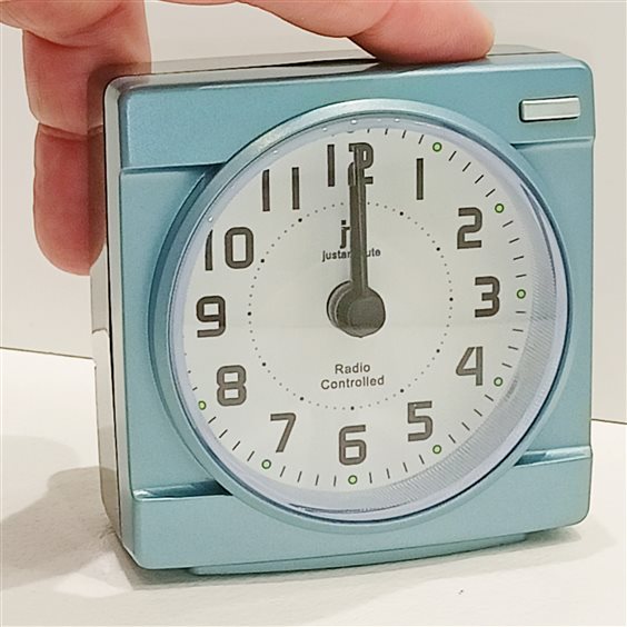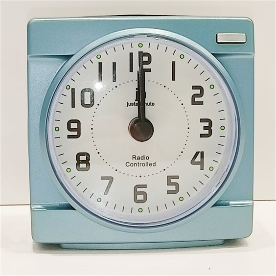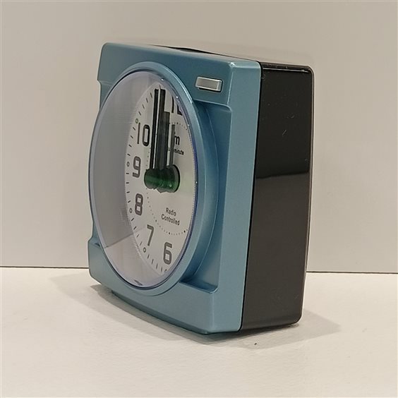 SVEGLIA IN PLASTICA RADIOCONTROLLATA COLORE AZZURRO/NERO, QUADRANTE BIANCO E NUMERI ARABI NERI. SFERE ORE, MINUTI E SECONDI.