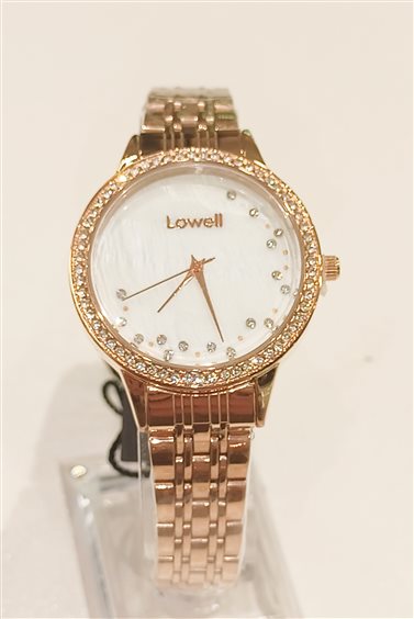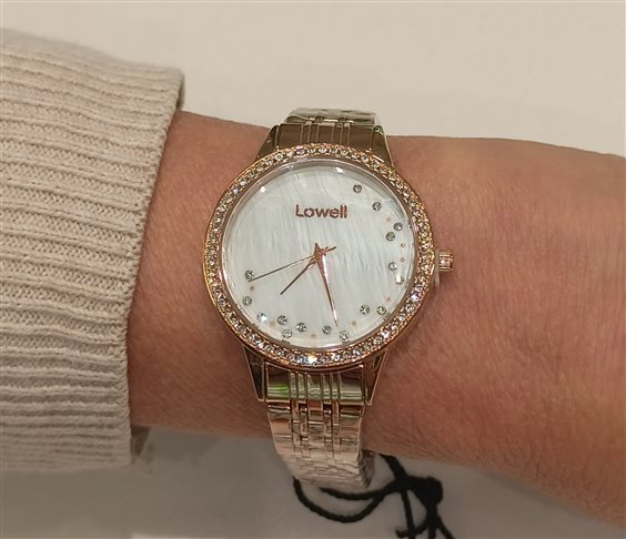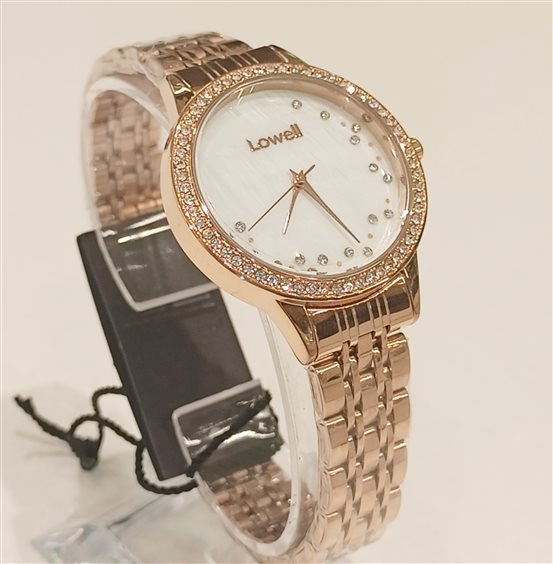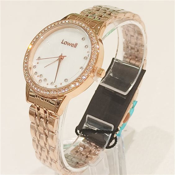 ELEGANTE OROLOGIO DA DONNA IN ACCIAIO COLORE ROSA CON ZIRCONI INCASSATI SU TUTTO IL PERIMETRO CASSA, SFERE ORA, MINUTI E SECONDI, QUADRANTE IN MADREPERLA CON ZIRCONI A SEMICERCHIO.