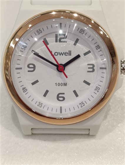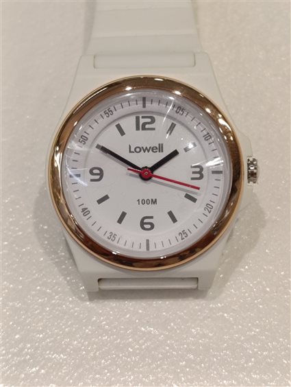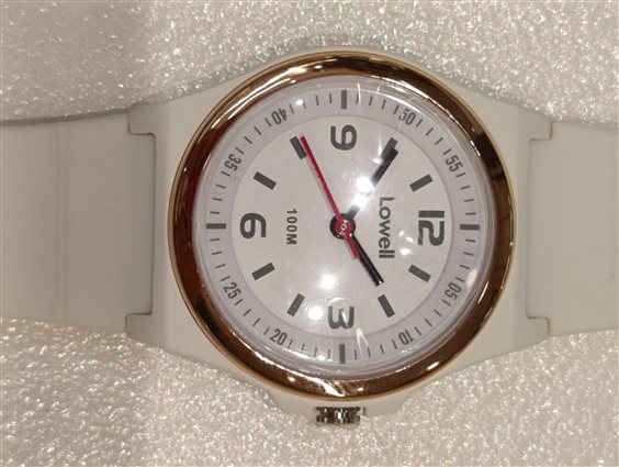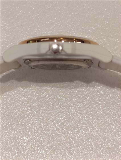 OROLOGIO DA DONNA PRATICO E DI FACILE LETTURA, SFERE: ORA, MINUTI COLOR NERO, SECONDI COLOR ROSSO. GHIERA COLOR ORO GIALLO, CASSA E CINTURINO COLORE BIANCO.
