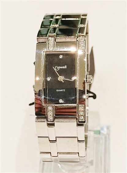 Elegante orologio donna cassa rettangolare con motivo ai lati di zirconi incassati, interamente in acciaio, cinturino regolabile con chiusura a scomparsa, indici con zirconi.