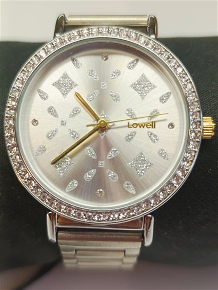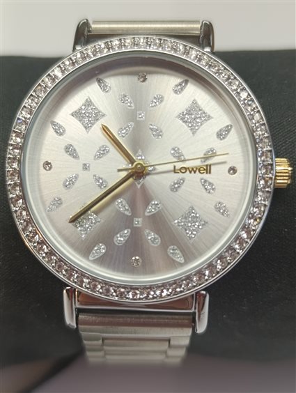 ELEGANTE OROLOGIO UNISEX IN ACCIAIO, QUADRANTE COLORE ARGENTO CON FANTASIA IN RILIEVO CON ZIRCONI APPLICATI, ASSENZA DI NUMERI SUL QUADRANTE, SFERE ORE, MINUTI E SECONDI COLORE DORATO. CORONA DORATA. GHIERA CON ZIRCONI SULL'INTERA CIRCONFERENZA. FONDO A SCATTO, CHIUSURA A SCOMPARSA. LOWELL AZIENDA ITALIANA DI OROLOGERIA.