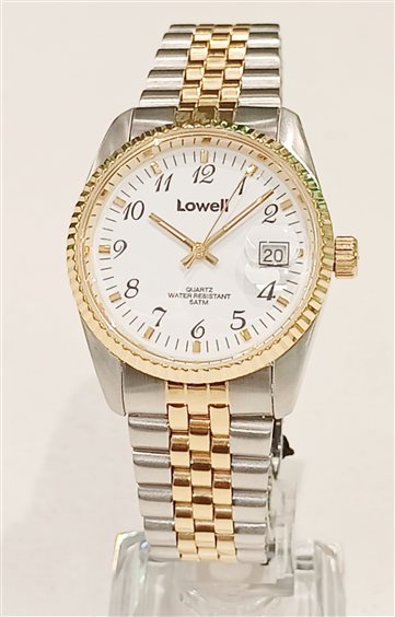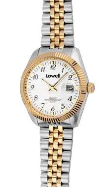 Orologio Lowell Unisex con cassa in acciaio placcato IPG, vetro minerale piatto con lentino, corona e fondello a vite, maglia di raccordo cassa con perni a molla, indicazione ore, minuti e secondi numerali stampati ed indici lucidi applicati lancette ore minuti luminescenti, datario a finestrella a ore tre, bracciale in acciaio bicolor acciaio e oro con chiusura e fibbia di sicurezza.
