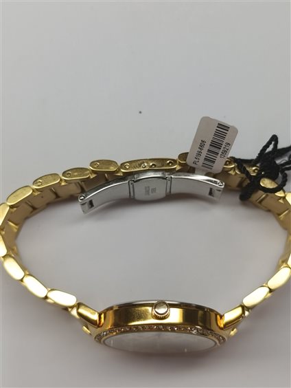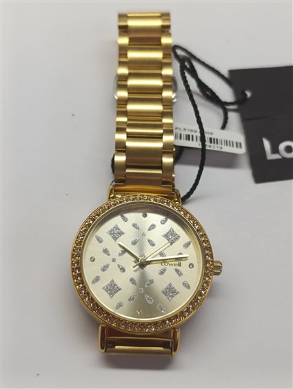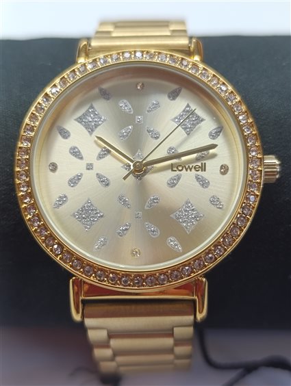 ELEGANTE OROLOGIO UNISEX IN ACCIAIO DORATO, QUADRANTE COLORE CREMA CON FANTASIA IN RILIEVO CON ZIRCONI APPLICATI, ASSENZA DI NUMERI SUL QUADRANTE, GHIERA CON ZIRCONI SULL'INTERA CIRCONFERENZA. FONDO A SCATTO, CHIUSURA A SCOMPARSA. LOWELL AZIENDA ITALIANA DI OROLOGERIA.