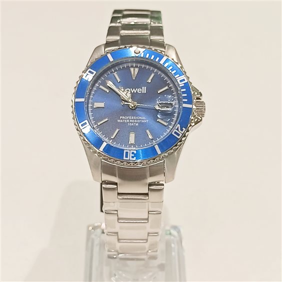 SPORTIVO OROLOGIO IN ACCIAIO, SFERE ORA, MINUTI E SECONDI CON GHIERA GIREVOLE BLU , QUADRANTE BLU E INDICI FLUORESCENTI.