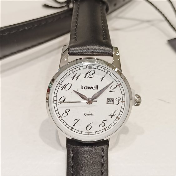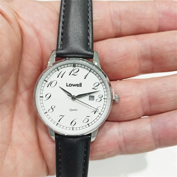 ELEGANTE OROLOGIO UOMO, CASSA IN ACCIAIO, CINTURINO IN PELLE COLOR NERO, QUADRANDE BIANCO NUMERI ARABI COLOR NERO.