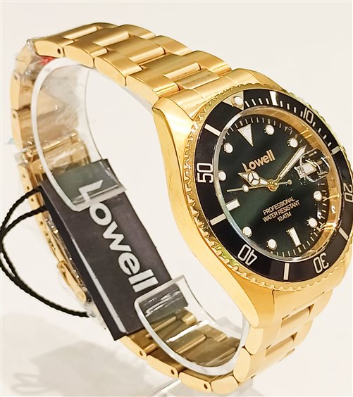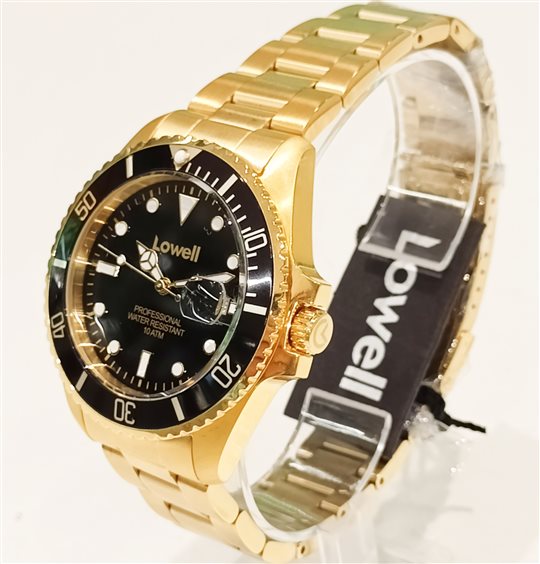 OROLOGIO Hurricane II gold - Cassa in acciaio PVD gold satinato e lucido diam. 40 mm. - Spessore 12 mm. - Vetro minerale piatto - Corona a vite personalizzata - Fondello a vite - Ghiera girevole unidirezionale con punto luminoso - Larghezza ansa 20 mm. - Movimento al quarzo Miyota 2115 - Batteria SR626SW - Indicazione ore, minuti e secondi - Numerali luminescenti in rilievo - Sfere luminescenti - Datario a finestrella ad ore tre con lentino - Bracciale solido in acciaio con chiusura deployante e fibbia di sicurezza - Dive suit extension per indosso sopra indumenti - Water resistant 10 ATM (100 metri) - Peso 126 gr.