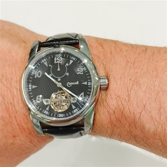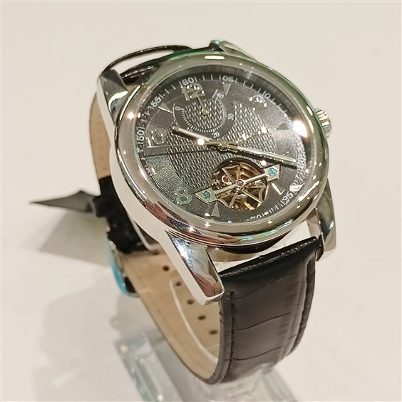IMPORTANTE OROLOGIO UOMO MECCANICO, CASSA IN ACCIAIO, FONDO SCHELETTRICO CHIUSO A VITE, QUADRANTE NUMERI E INDICI IN RILIEVO COLORE ACCIAIO, CINTURINO IN PELLE NERO, OTTIMO RAPPORTO QUALITA PREZZO.