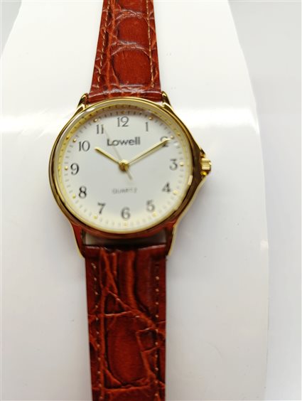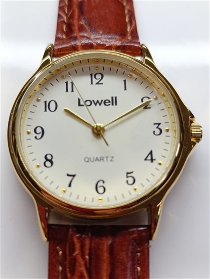 ELEGANTE OROLOGIO UOMO/DONNA, CASSA IN ACCIAIO COLORE ORO GIALLO, QUADRANTE COLOR CREMA NUMERI ARABI NERI, SFERE ORA MINUTI E SECONDI.