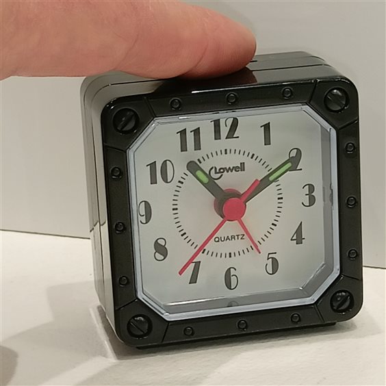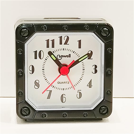 PICCOLA SVEGLIA IN PLASTICA COLORE NERO, QUADRANTE BIANCO E NUMERI ARABI NERI.