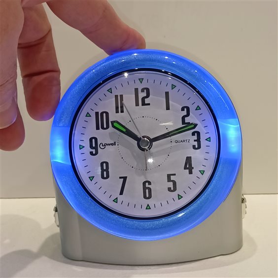 SvEGLIA da comodino MULTIFUNZIONE CON SUONERIA A BEEP LUCE E SNOOZE. COLORE LUNETTA AZZURRO. comoda da usare stabile e di ottima lettura.
