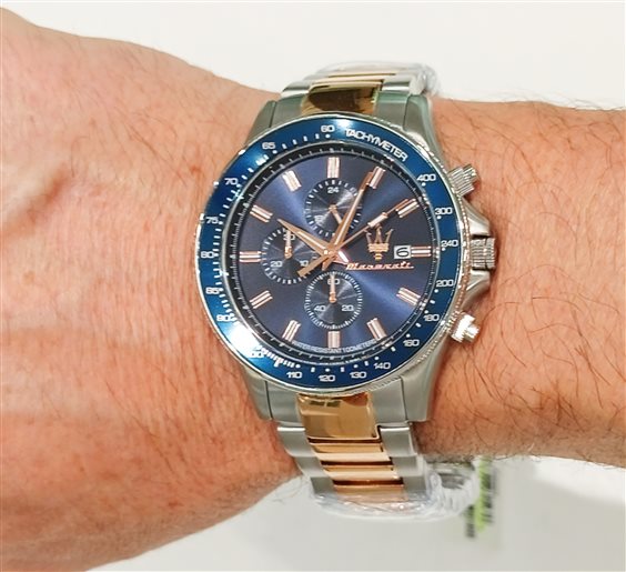 Orologio Maserati sfida quadrante blu cinturino metallo e colore oro. Materiale e finitura cassa in Acciaio, misura cassa 44mm, spessore cassa 11,40. Cinturino in metallo, water resistant 10atm