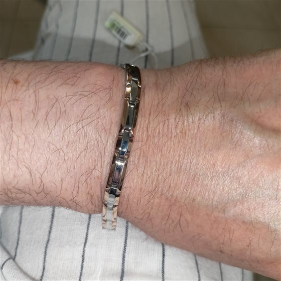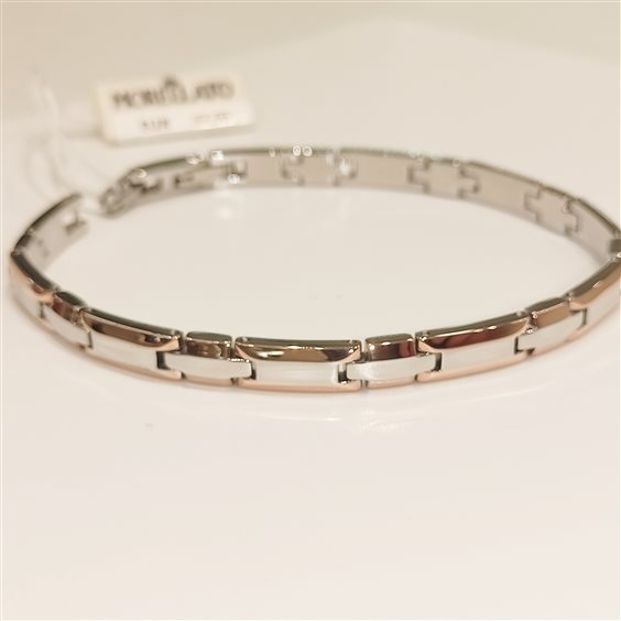 Bracciale uomo in acciaio 316L , maglia fantasia con finiture in PVD oro rosè , lunghezza cm 21,5 regolabile fino a cm 19,5. L'immagine è indicativa , la confezione può variare di forma e colore.