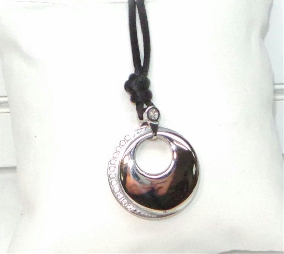 collana acciaio cristalli e diamante, pendente forma circolare sinuoso liscio lucido splendente stupendo. collana di seta.