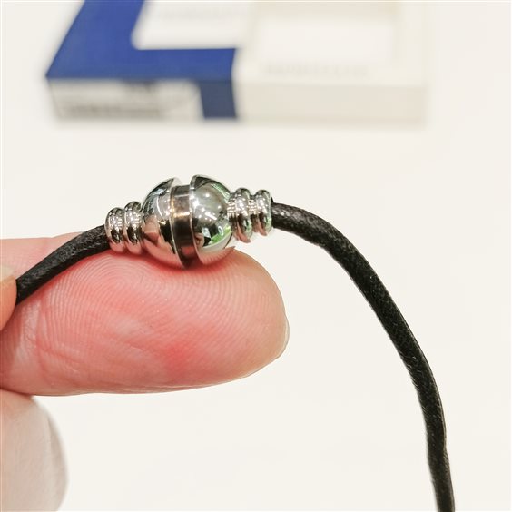 COLLANA UOMO IN CORDONCINO NERO CON CENTRALE IN ACCIAIO FORMA DUE SEMISFERE VICINE.