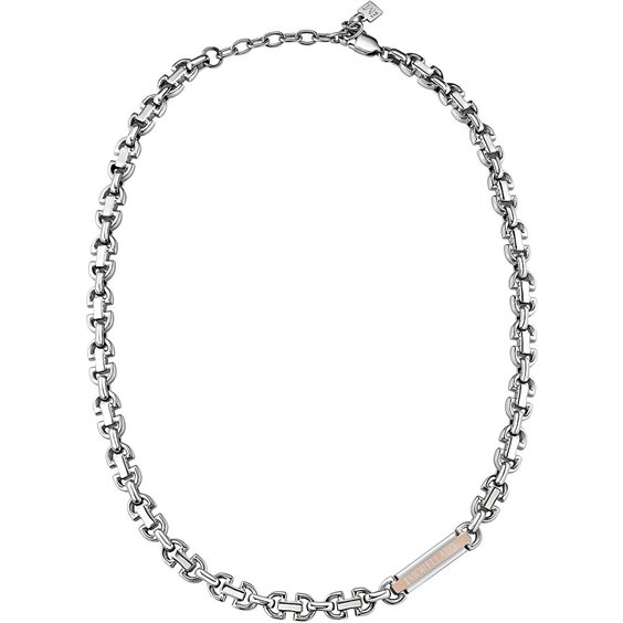 Collana uomo in acciaio 316L , catena maglia fantasia , lungheza cm 50 regoabile fino a cm 45 , targhetta con finiture in PVD oro rosè. Immagine indicativa , la confezione può variare di forma e colore.