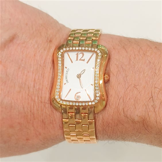 MORELLLATO: master. dorato. vetro minerale. cristalli. movimento solo tempo myota. bracciale fresato dal pieno . chiusura deployante a pulsante di sicurezza.