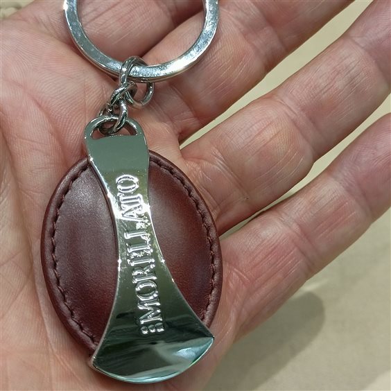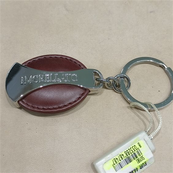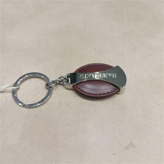 PORTACHIAVI IN ACCIAIO E PELLE, SPORTIVO CON MOTIVO OVALE IN PELLE COLOR CUOIO E LOGO CENTRALE SU PIASTRA LUCIDA.