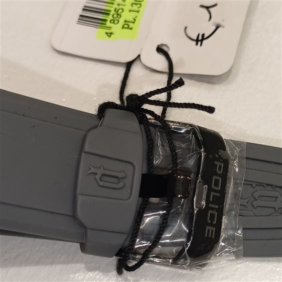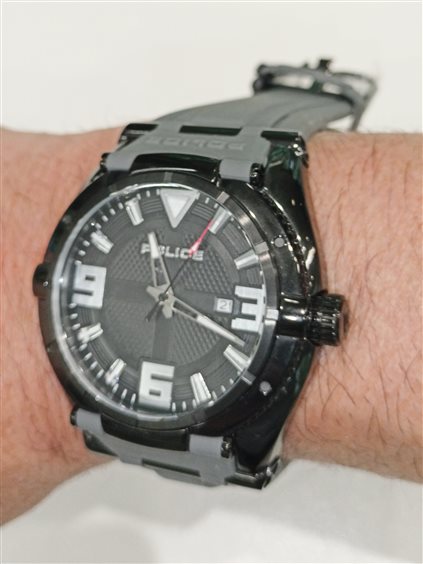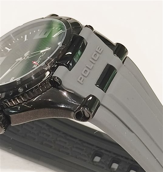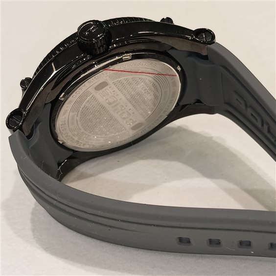 IMPORTANTE OROLOGIO CON CASSA IN ACCIAIO COLORE NERO QUADRANTE NERO, INDICI E NUMERI ARABI IN RILIEVO, SFERA SECONDI. FONDO CHIUSO A VITE. cinturino in morbido silicone color grigio.