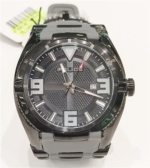 IMPORTANTE OROLOGIO CON CASSA IN ACCIAIO COLORE NERO QUADRANTE NERO, INDICI E NUMERI ARABI IN RILIEVO, SFERA SECONDI. FONDO CHIUSO A VITE. cinturino in morbido silicone color grigio.