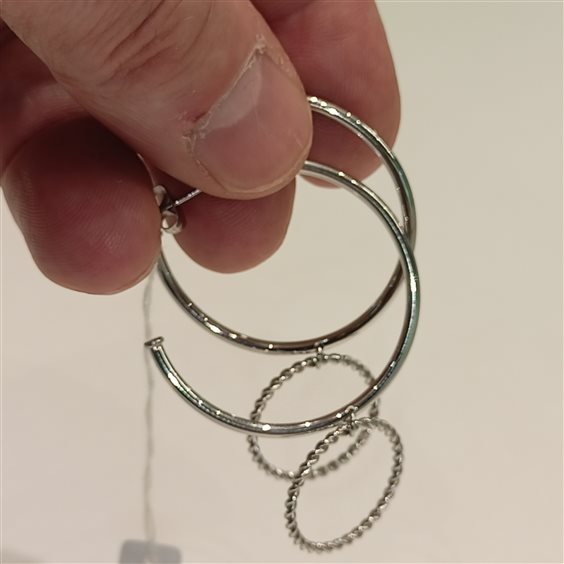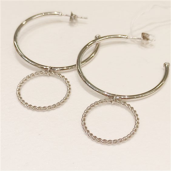 GIOVANI ORECCHINI IN ACCIAIO A CERCHIO CON AGO E FARFALLA, CERCHIO PIU PICCOLO A FILO INTRECCIATO ALLA BASE DEL GRANDE.