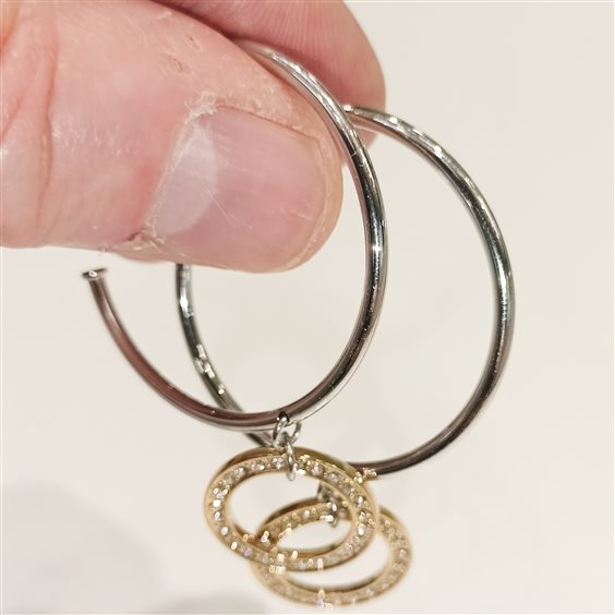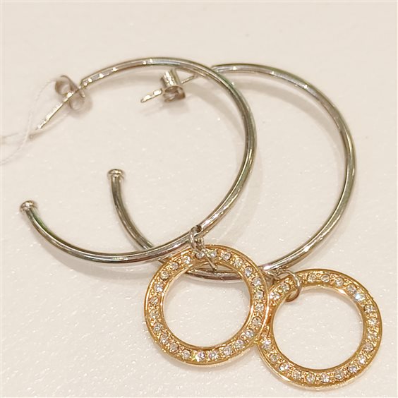 GIOVANI ORECCHINI IN ACCIAIO E ACCIAIO DORATO. CERCHIO GRANDE CON PERNO E FARFALLA, CERCHIO PICCOLO CON ZIRCONI NEL CONTORNO.