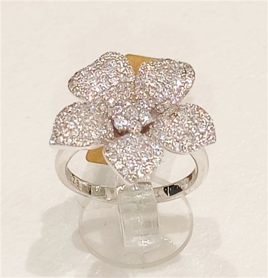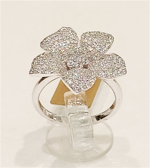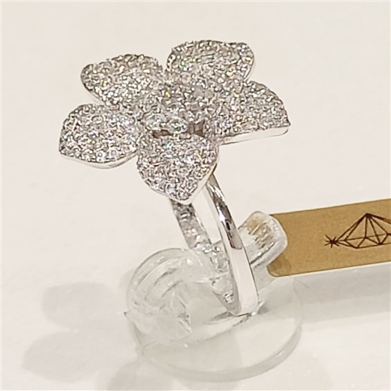 ELEGANTE ANELLO FANTASIA FIORE, IN ARGENTO E ZIRCONI INCASSATI A GRIFFE.