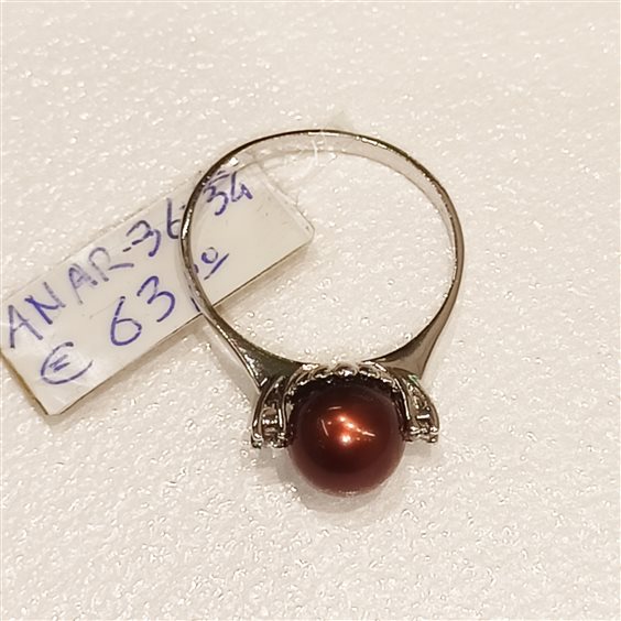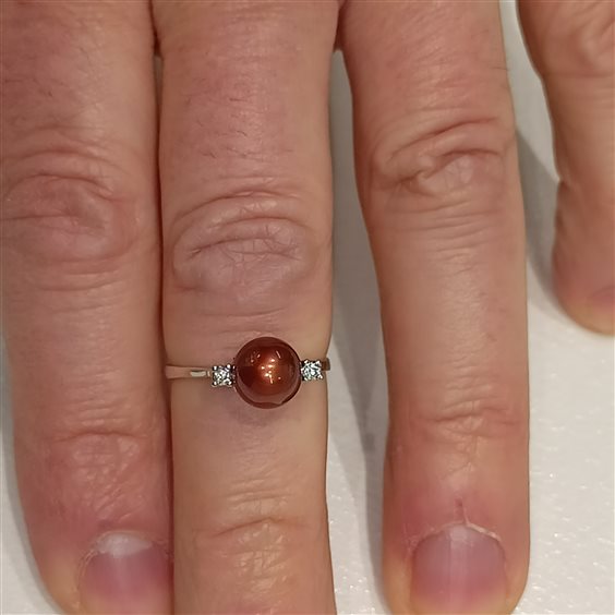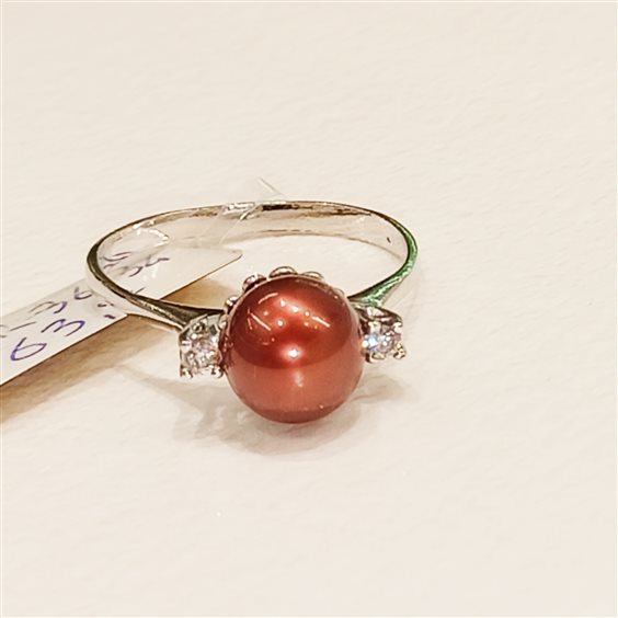 BELLISSIMO ANELLO IN ARGENTO E PERLA COLOR AMBRA, AI LATI DUE PICCOLI ZIRCONI BIANCHI INCASSATI A GRIFFE,