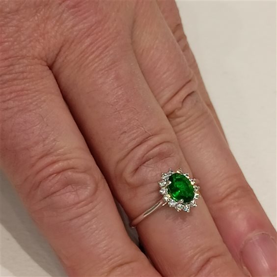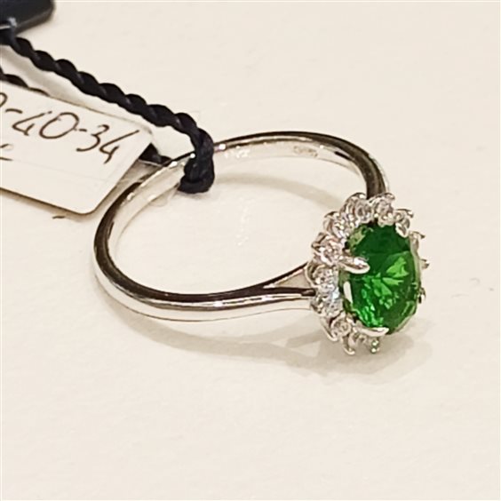 ELEGANTE ANELLO IN ARGENTO MODELLO KATE CON PIETRA CENTRALE CORINDONE VERDE E CONTORNO DI ZIRCONI BIANCHI, TUTTO INCASSATO A GRIFFE.