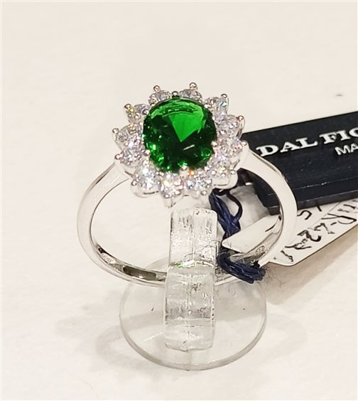 ELEGANTE ANELLO IN ARGENTO MODELLO "KATE" CON PIETRA CENTRALE IN CORNIDONE VERDE E CONTORNO IN ZIRCONI BIANCHI, TUTTO INCASSATO A GRIFFE.