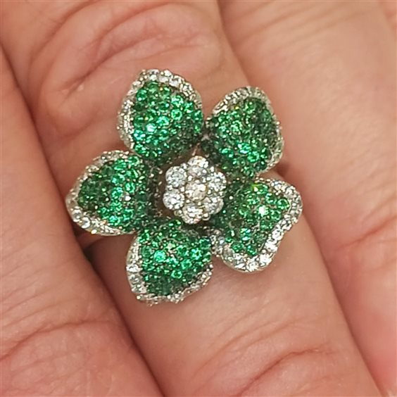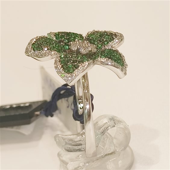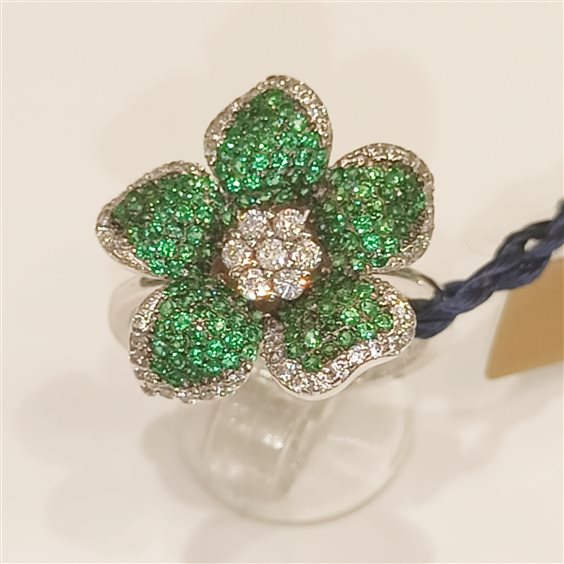 Elegante anello fantasia a forma di fiore con zirconi bianche e verdi incassati a griffe.
